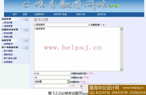 摘 要:本文叙述了教学方式及考试方式的历史、现状、以及ASP.NET语言和SQL server2000数据库管理系统的概况。重点介绍了C语言教学网站、网上考试系统和在线交流模块的实现过程:包括系统分析、系统调查、数据流程分析、功能设计、数据库设计、系统的运行环境、系统测试及调试。本系统主要面向两类人员使用:管理员(教师)、普通学生,他们拥有不同的权限。考试模块使用的过程是管理员添加试题,制订出题规则,生成试卷。学生登录后选择要考的试卷然后进入答题,完毕后提交试卷,存入数据库并评分。系统管理员可以查询考生的成绩,每个考生只能查询自己的成绩。教学网站模块,管理员添加教学文档,并对文档进行分类、修改等操作,而普通用户只能浏览内容。在线交流模块中,任何用户都可以登录留言,管理员可以删除留言。另外总结了本系统的特点:节约教学成本,提高考试工作的效率。