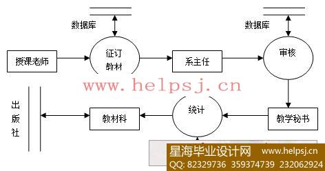 系统共有五类用户: (1) 教师:各老师将下学期各年级所需教材的名称、出版社、课程名、作者名、授课教师、出版时间、教材类型(外文、优秀教材、习题集等)等信息录入到表中,生成教材征定表单。 (2) 系主任:各系用户(主任等人)查看本系教师的教材申报情况,并进行审核。 (3) 教学秘书:各系教学秘书可以查看本系已通过审核的教材,并统计学生需要教材的数量。 (4) 教材科:教材科用户可以查看各系的已经通过审核的教材申报情况,并可以查询、统计记录。 (5) 管理员:对各用户进行添加、删除、修改、密码设定以及数据维护。 (星海毕业设计 www.helpsj.cn)