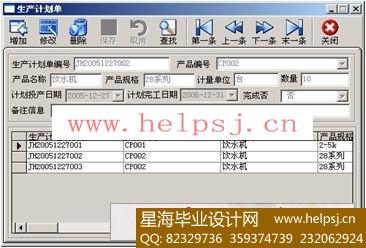 生产管理系统是一个典型的数据库开发应用程序,由基础信息管理模块、计划信息管理模块、生产设备管理模块、产品库存管理模块、辅助功能模块、系统维护模块、帮助信息模块7个功能模块组成,规划系统功能模块如下: 基础信息管理模块 该模块主要包括产品基础信息、物料基本信息、设备状态设置、设备类型设置、设备摊销时间设置、车间部门设置6部分组成。 计划信息管理模块 该模块主要包括生产计划单管理、生产计划单查询、物料需求计划、物料需求查询4部分。 生产设备管理模块 该模块主要由生产设备档案、生产设备查询、生产设备报废、生产设备报废查询、生产设备维修、生产设备维修查询6部分组成。 产品库存管理模块 该模块主要由产品完工入库、产品入库查询、物料入库、物料入库查询、生产领料、生产领料查询、物料库存信息查询7部分组成。 辅助功能模块 该模块主要包括调用Word、调用Excel、调用计算器、登录Internet、工作备忘5部分。 系统维护模块 该模块主要由操作员设置、密码修改、操作权限设置、数据清理、数据备份与恢复、设置主窗口图片6部分组成。 帮助信息模块 该模块主要有:本单位信息、关于、帮助。( 星海毕业设计 www.helpsj.cn )