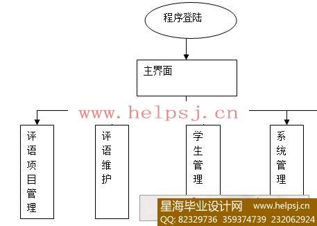 系统简介(星海毕业设计 www.helpsj.cn) 本系统主要由以下功能模块构成: 一. 评语项目管理(增加评语项目,删除选定项目,增加项目分类,删除项目分类) 二. 评语维护 三. 学生管理(查找学生,添加学生,删除学生,添加新评语) 四. 系统管理(修改密码,添加用户,退出系统) 系统开发的目标和思想 本系统主要服务于教师对学生写评语的工作.利用本评语生成系统,教师可以方便的快捷的给班级的学生写评语,主要操作是定位学生对数据库添加评语信息,最后可以完成对学生的查询以及评语的修改. 系统的可行性分析 技术上:本系统采用visual basic 6.0与微软的access作为数据库,技术上开发难度一般. 经济上:本系统服务于学校教师,提高了教育工作者办事效率,节省了开支.所以具有经济上的可行性. 社会上:本系统同时也方便了广大老师写评语寻求者,以及家长.所以具有社会可行性.