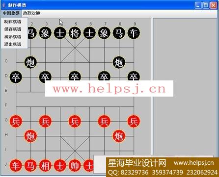 本系统主要实现如下目标: 系统实现:象棋棋谱界面,记录棋步,走棋与吃棋,胜负判断, 设计中国象棋主菜单,下拉分菜单为:制作棋谱,保存棋谱,演示棋谱,退出棋谱。 制作棋谱:实现棋谱的显示,可以实战对弈功能,下棋规则的监督。 保存棋谱:实现棋谱的保存,并生成一个棋谱文件,以便演示棋谱时使用。 演示棋谱:实现对弈过程的演示,可以自动演示也可手动演示,并有时间的控制。 退出棋谱:对话框提示,是否退出系统。(星海毕业设计www.helpsj.cn QQ:82329736 )