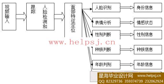 下面介绍系统中的各模块的功能及算法: 图像获取模块 该模块主要是从摄像头拍照后进行获取图片,也可以从图片库中获取,获取后的图片可以在软件的界面中显示出来以便进行识别。 人脸区域获取 该系统中图像里人脸区域的获取,主要是根据肤色来进行获取,通过肤色非线形分段色彩变换来实现。这一非线性分段色彩变换得到的肤色模型属于色彩空间中的聚类模型,这一类肤色模型的建立首先要选取一种合适的色彩空间。 图像预处理模块 图像预处理就是对获取得来的图像进行适当的处理,使它具有的特征能够在图像中明显的表现出来。该模块中的子模块有如下5个,下面对它们进行概述: •光线补偿[3] 因为系统得到的图片可能会存在光线不平衡的情况,这会影响我们对特征的提取,同时系统中要用到YcrCB色彩空间,所以有必要对图像进行光线补偿。尽可能将它的特征在图像中表现出来。YcrCB是一种色彩空间,它用于视频系统中,在该色彩空间中,Y分量表示像素的亮度,Cr表示红色分量,Cb表示蓝色分量,通常把Cr和Cb称为色度。YcrCB色彩空间是以演播室质量标准为目标的CC601编码方案中采用的彩色表示模型。 •灰度变化[4] 图像灰度化的过程就是把彩色图像转换为黑白色图像的过程,它也是为了将图像的信息更加具体、简单的表现出来,但是,这样做也将会丢失图像信息。因此,尽可能在转化的过程中用简单的方式表现图像复杂的信息。 •高斯平滑处理[5] 高斯平滑将对图像进行平滑处理,在图像采集过程中,由于各种因素的影响,图像往往会出现一些不规则的噪声,入图像在传输、存储等都有可能产生数据的丢失。从而影响图像的质量。处理噪声的过程称为平滑。平滑可以降低图像的视觉噪声,同时出去图像中的高频部分后,那些本来不明显的低频成分更容易识别。平滑可以通过卷积来实现。经过卷积平滑后的水平投影后,二值化提供了较好的图像效果。 •对比度增强[6] 对比度增强,就是对图像的进一步处理,将对比度再一次拉开。它针对原始图像的每一个像素直接对其灰度进行处理的,其处理过程主要是通过增强函数对像素的灰度级进行运算并将运算结果作为该像素的新灰度值来实现的。通过改变选用的增强函数的解析表达式就可以得到不同的处理效果。 •二值化[7] 二值化的目的是将采集获得的多层次灰度图像处理成二值图像,以便于分析理解和识别并减少计算量。二值化就是通过一些算法,通过一个阈值改变图像中的像素颜色,令整幅图像画面内仅有黑白二值,该图像一般由黑色区域和白色区域组成,可以用一个比特表示一个像素,“1”表示黑色,“0”表示白色,当然也可以倒过来表示,这种图像称之为二值图像。这便有利于我们对特征的提取。该设计中采用组内方差和组外方差来实现二值化。 •直方图均衡[8] 直方图均衡化的目的是使一输入图像转换为在每一灰度级上都有相同的象素点数,它的处理的中心思想是把原始图像的灰度直方图从比较集中的某个灰度区间变成在全部灰度范围内的均匀分布,它的研究思路是:通过直方图变换式来进行直方图的均衡处理,直方图变换式是 但是直方图均衡化存在着两个缺点: 1)变换后图像的灰度级减少,某些细节消失; 2)某些图像,如直方图有高峰,经处理后对比度不自然的过分增强。 人脸定位模块 人脸定位是将典型的脸部特征(如眼睛,鼻尖,嘴唇等等)标记出来,在本系统中,定位的特征是眼睛,鼻尖和嘴巴三个。由于眼睛具有对称性,因此可以很快就能标记出来,而鼻子是在眼睛下面,且嘴巴在鼻子下面,所以只要眼睛标记好,鼻子和嘴巴也能相应的标记出来。 特征提取模块 特征提取按以下4个步骤进行: (1)、提取两只眼睛的距离 (2)、眼睛的倾角度 (3)、眼睛、嘴巴的重心 (4)、用一个矩形标出每一个特征 在特征提取完之后将会得到相应的特征值以便存入后台数据库。 识别模块 该模块通过与库存中的特征向量进行比较,找出与特征最相近的参数,再对该参数进一步分析。如果分析在我们所确认的范围内,我们就认为该人就是我们所要找的。然后从库存中提取出该人相关的信息,并显示出来。如果库存中没有,则给出提示是否对存库作为样本。( 星海毕业设计 www.helpsj.cn )